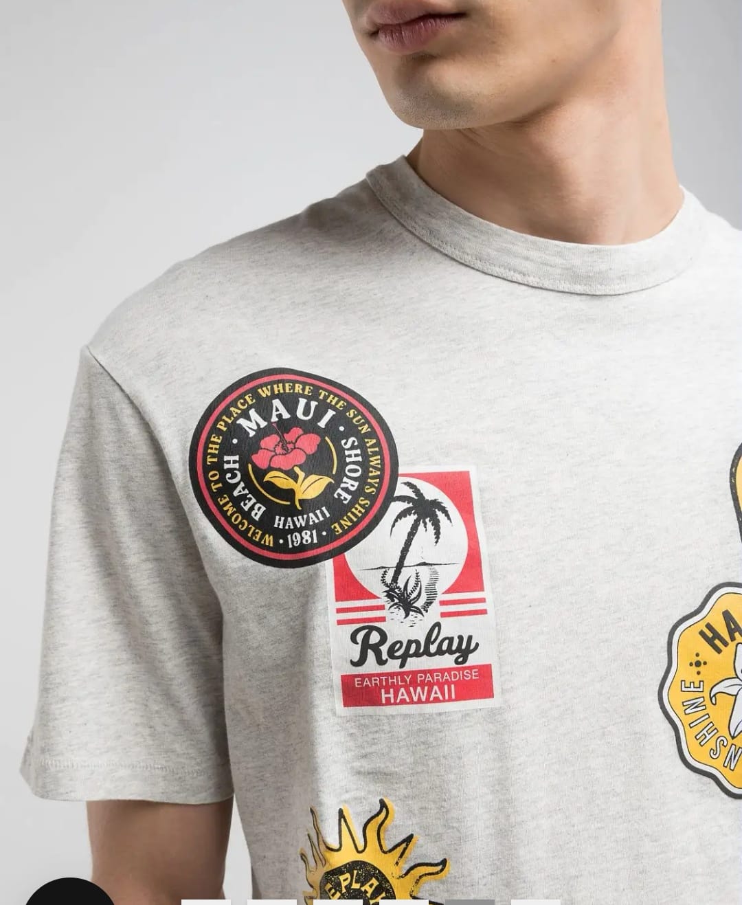Camiseta Replay 100% algodón ,corte Relajado ,con estampado efecto parches en la parte delantera, color Light Grey.
